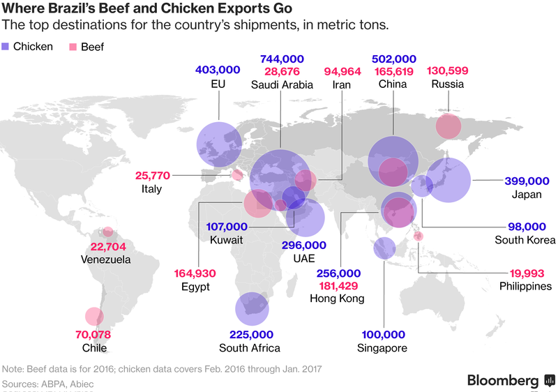 Secondo un articolo firmato da Anna Flávia Rochas del 24 marzo 2017 e pubblicato sul sito Meatingplace, JBS, una delle grandi aziende coinvolte nello scandalo della carne, ha deciso di sospendere l’attività per tre giorni in 33 dei 36 macelli bovini situati in Brasile, a causa della mancanza di richieste da parte dei Pesi che hanno interrotto le importazioni. Per i prossimi giorni l’azienda ha in programma una riduzione del 35% della produzione. Secondo dati pubblicati da BTG Pactual le vendite di carne del Brasile verso: Cina, Hong Kong, Egitto e Cile rappresentano oltre il 53% delle esportazioni del settore.