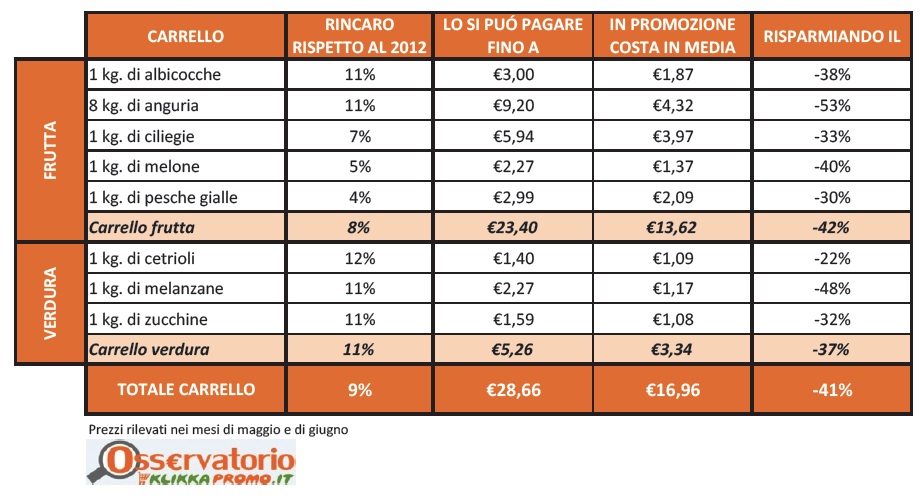 Come mettersi al riparo da questa “pioggia di aumenti”? La risposta è una spesa oculata approfittando delle promozioni che il sito segnala ogni giorno. In questo modo una famiglia media potrebbe spendere ogni settimana per l’acquisto di frutta e verdura 17 € e non 29 €, con un risparmio del 40%. Approfittando delle offerte, ad esempio, il costo delle angurie può scendere da 1,15 € a poco più di 50 centesimi e quello delle melanzane da 2,27 a 1,17 €.