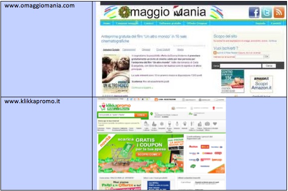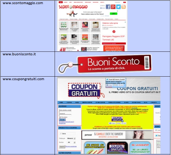 Ci sono numerosi altri siti web, come Scontomaggio.com, Omaggiomania.com, Coupondastampare.it, che veicolano buoni sconto e campioni omaggio, a volte con sistemi più articolati rispetto alla stampa di coupon. Per trovarli basta inserire le parole chiave “buoni sconto” nel motore di ricerca.