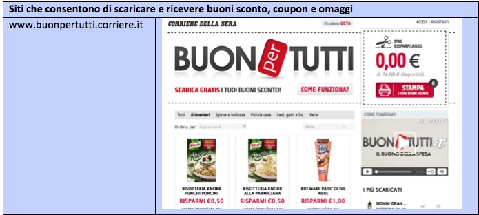 Si chiama BuonperTutti ed è uno degli ultimi siti, a firma del Corriere della Sera, che consente di scaricare buoni sconto. Ha un approccio immediato che permette di ottenere i coupon in tre semplici passaggi. L’impegno è minimo: ci si registra, si selezionano i buoni sconto, si stampano e si usano per fare la spesa. Al termine della registrazione si riceve una e-mail nella quale viene indicato il tetto massimo di risparmio, pari a 75 euro.
