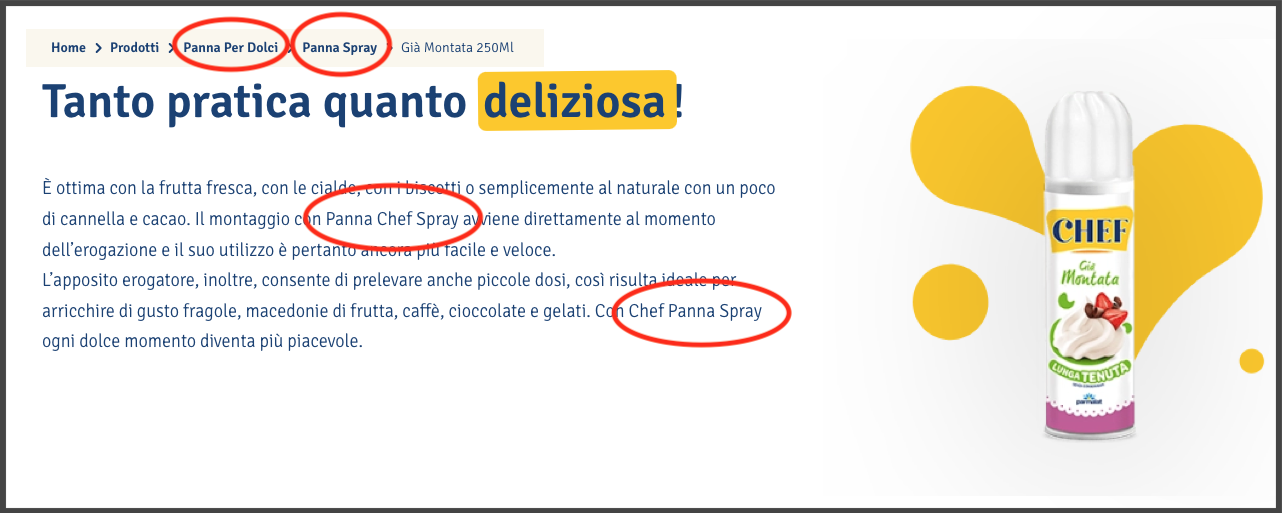 Eppure sul sito ufficiale dell’azienda, Parmalat, sia nella sezione “panna per dolci” sia nella descrizione del prodotto compare più volte la parola “panna”. Si legge: “Il montaggio con Panna Chef Spray avviene direttamente al momento dell’erogazione…” e ancora: “Con Chef Panna Spray ogni dolce momento diventa più piacevole”. Sul sito dell’ecommerce invece il termine “panna” compare solo nella categoria in cui è inserito il prodotto ma non nella descrizione dello stesso.