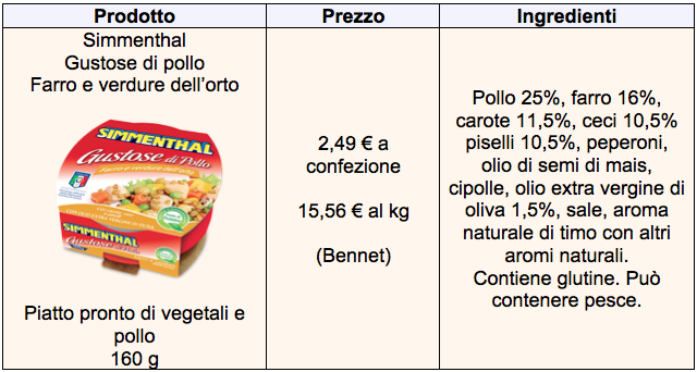 L’eventuale nota dolente di Gustose di Pollo Simmenthal è il prezzo abbastanza elevatoa 2,49 euro a confezione, il che si traduce in più di 15 euro al kg. Per un consumo fuori casa il prezzo è accettabile, anche se non si tratta di un pasto completo e quindi va integrato con altri componenti (pane, frutta per esempio).