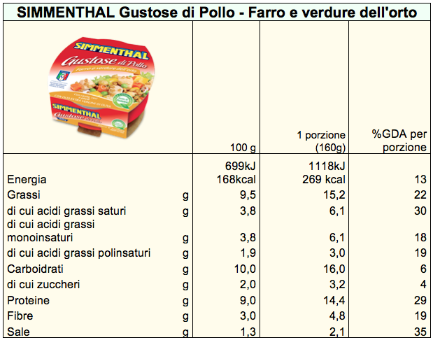 Nell’analizzare gli ingredienti abbiamo considerato nello specifico l’insalata di Farro e verdure dell’orto che contiene oltre alla carne, carote, ceci, peperoni, olio e aromi naturali.