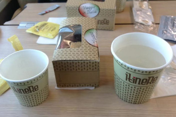 Da parte nostra, vorremmo aggiungere qualche considerazione sulla scelta del dolce: due torte apparentemente con scadenza in giornata, una delle quali contiene emulsionanti, latte scremato condensato in polvere, acidificanti, conservanti, uova pastorizzate. Forse si potrebbe far meglio per promuovere la gastronomia italiana sui nostri treni.