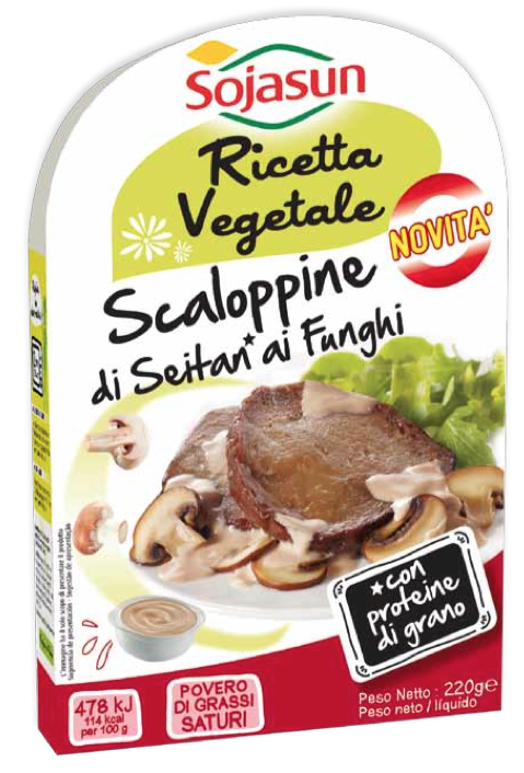Un piatto pronto proteico alternativo, disponibile nel banco frigo del supermercato: sono le Scaloppine di Seitan ai funghi della linea Ricetta vegetale dell’azienda Sojasun.