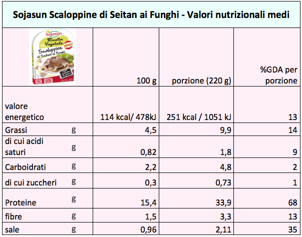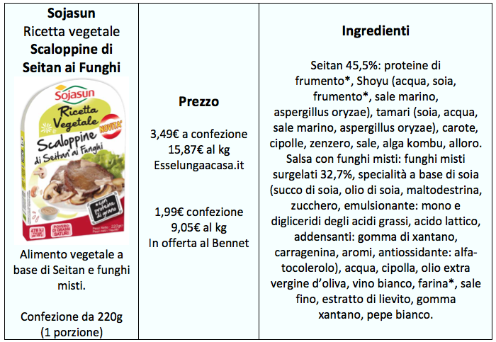 Il prodotto che si trova al supermercato è un piatto pronto: scaloppine di seitan ai funghi, in vaschetta pronta monoporzione per essere riscaldata al microonde per 2 minuti o in padella per 4/5 minuti. La lista degli ingredienti è piuttosto lunga non tanto per quanto riguarda il seitan, per cui ci sono solo due salse a base di soia, ma piuttosto per il contorno (vedi tabelle sotto). I funghi, peraltro non freschi ma surgelati, sono in una salsa di soia, composita e che prevede addensanti e antiossidanti.