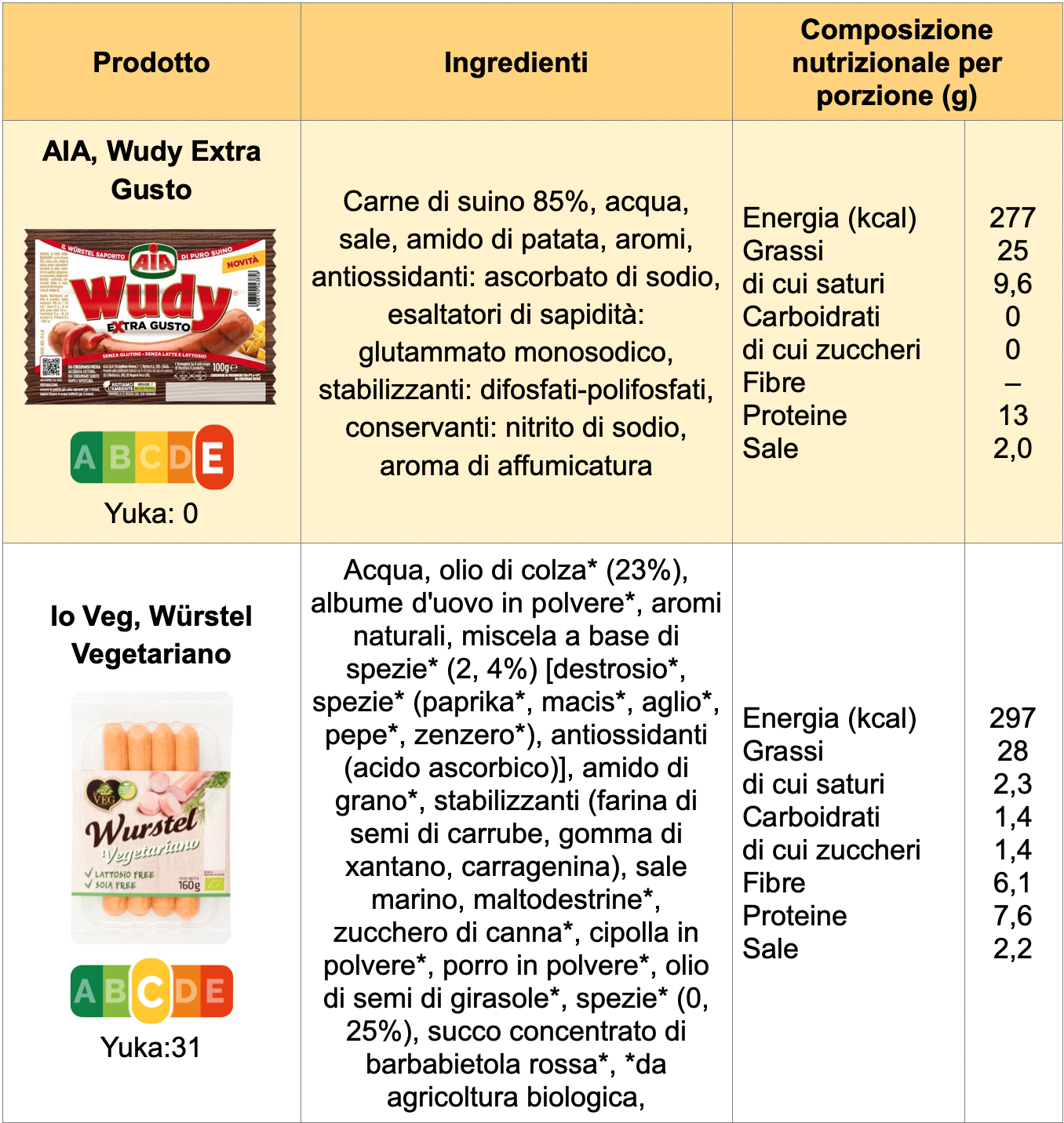 La tabella riporta, a puro titolo di esempio, il confronto fra un burger vegetale e uno a base di carne, e fra un würstel di suino e uno a base vegetale. Confrontando i due prodotti vediamo che il sale, pari al 2,2% nel würstel vegetale e al 2% in quello di suino, è troppo elevato in entrambi i prodotti. I grassi, sono pari al 25 e al 28% nel prodotto di suino e in quello vegetale, rispettivamente, mentre i grassi saturi, che nel würstel di suino arrivano al 9,6%, in quello vegetale si fermano al 2,3%. Le fibre, assenti nel prodotto di suino, sono il 6,1% in quello vegetale. La valutazione del Nutri-Score1 è E per i würstel di suino e C per quelli vegetali.