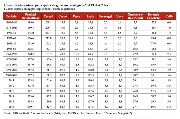Come si vede dalla tabella, l’incremento dei consumi riguarda quasi tutti i prodotti, a eccezione dei cereali e delle bevande alcoliche, per i quali si è registra una tendenza opposta. La carne è passata dai 15,5 kg pro capite l’anno (in media) fino a 80 kg. Un aumento consistente si registra per latte e formaggi. I prodotti ortofrutticoli sono passati da 200 kg pro capite annui a oltre 300. Esagerato e preoccupante risulta l’aumento di zucchero: da 3,5 kg annui pro-capite ai 27 attuali che rappresenta quasi un record.