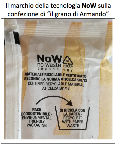 L’altro elemento importante è l’imballaggio realizzato in materiale riciclabile certificato NoW-no waste (niente sprechi) che si ricicla con la carta. NoW-no waste è una tecnologia brevettata Policarta che consente di realizzare un poliaccoppiato (carta e plastica) facilmente separabile per recuperare sia la parte cartacea sia i film plastici. La confezione degli spaghetti alla chitarra Bennet non è certificata NoW anche se il materiale risulta essere un poliaccoppiato carta e plastica e indica la stessa sigla (C/PAP 81).