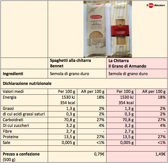 Per il consumatore l’elemento di differenziazione sostanziale tra i due prodotti resta il prezzo. La confezione da 500 g di Grano di Armando costa 1,49 €, mentre gli spaghetti alla chitarra targati Bennet scendono a 0,79 € . La differenza è consistente visto che il prezzo della marca risulta quasi il doppio. Capire i motivi di un divario così vistoso non è semplice, anche considerando elementi importanti come il controllo di filiera, la riduzione dell’impatto ambientale degli imballaggi e i costi di distribuzione. Forse in questo caso il nome della marca pesa tanto.