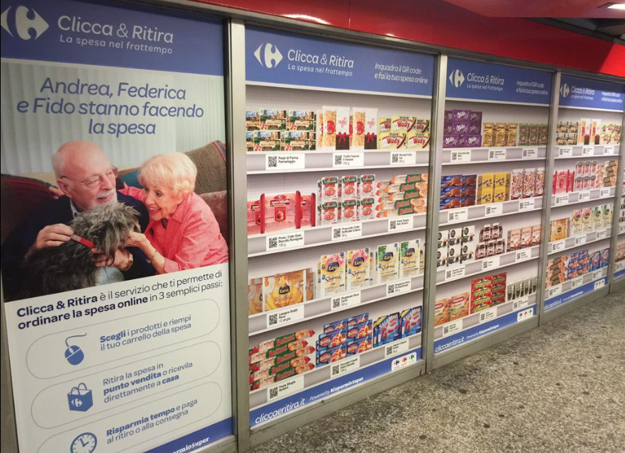 A Milano, nella stazione della metropolitana di Loreto, ha aperto il primo negozio virtuale, lungo più di duecento metri, con esposti oltre mille prodotti della grande distribuzione, che possono essere ordinati online, scansionando i codici con il proprio smartphone, per poi ritirali in un supermercato Carrefour o farseli consegnare a domicilio. La spesa, ovunque venga ordinata, può essere ritirata nel negozio preferito già un’ora dopo l’ordine, saltando la fila, grazie ad una cassa dedicata. In alternativa si può scegliere il servizio di consegna a domicilio, gratuita per consegne sopra i 70 euro, disponibile già tre ore dopo l’ordine. L’idea è quella di far risparmiare tempo ai consumatori che possano poi dedicare a cose più piacevoli.