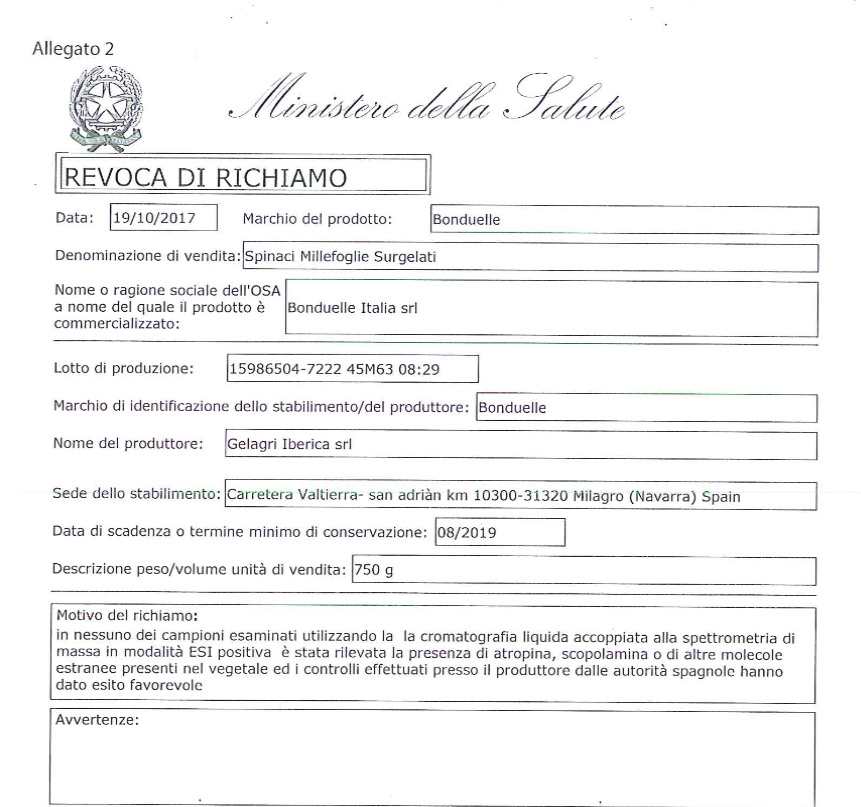 L’allerta del Ministero della salute che martedì 3 ottobre segnalava il richiamo e il ritiro dagli scaffali dei supermercati di 6 lotti di Spinaci Bonduelle surgelati, è rientrata (vedi primo e secondo richiamo). La revisione dell’analisi effettuata dall’Agenzia di Tutela della Salute della Città Metropolitana di Milano confermano che non c’è presenza di sostanze anticolinergiche all’interno del prodotto (ovvero di mandragora, l’erba infestante velenosa, la cui presenza era stata ipotizzata inizialmente).
