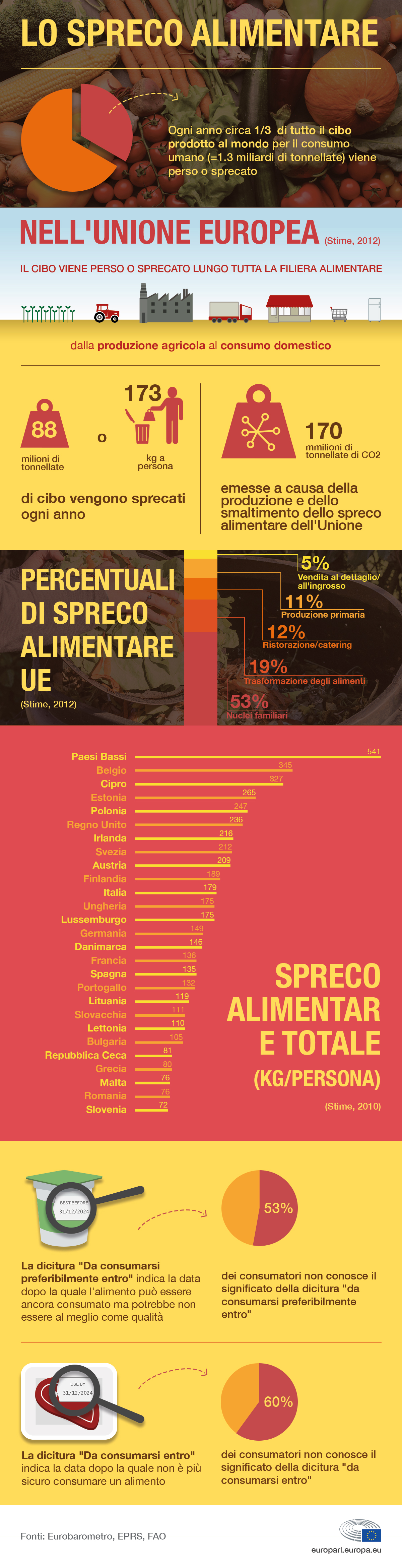Ogni anno in Europa si sprecano 88 milioni di tonnellate di cibo, per un totale di ben 173 chilogrammi a persona. I più spreconi sono gli olandesi (541 kg/persona), mentre i più virtuosi sono gli sloveni (72 kg/persona). L’Italia con i suoi 179 kg pro capite è, invece, poco al di sopra della media europea. Queste stime sono state diffuse nei giorni scorsi dal Parlamento europeo, che il 16 maggio si è impegnato a adottare una serie di misure per ridurre lo spreco alimentare del 30% entro il 2025 e del 50% entro il 2030.