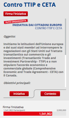 La raccolta firme contro TTIP e CETA , portata avanti da un’alleanza di oltre 470 organizzazioni della società civile, contro il progetto di accordi commerciali tra Stati Uniti e Canada con l’Europa, ha raggiunto quota 2 milioni. È la prima volta che un’iniziativa promossa da cittadini europei raggiunge un numero di consensi così alto. L’obiettivo è arrivare a 2,5 milioni entro il 6 ottobre. Domani ci sarà un importante appuntamento per l’accordo. Il Parlamento Europeo si riunirà a Strasburgo per discutere e passare la Risoluzione Lange.