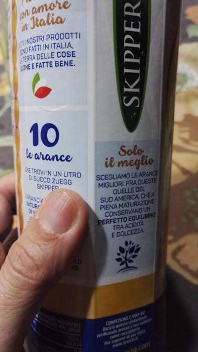 Abbiamo ricevuto questa foto da una nostra lettrice, che ha notato una cosa curiosa sulla confezione di succo d’arancia Skipper Zuegg. Una frase in evidenza presente sulla confezione dice che “tutti i prodotti sono fatti in Italia, la terra delle cose buone e fatte bene”.
