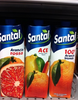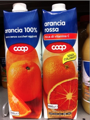 Sullo scaffale a fianco ci sono tre proposte : Santal Arancia rossa, Santal Ace e Santal 100% arancia bionda. Anche in questo caso il problema è lo stesso, le fotografie sono molto simili confondono le idee anche se va detto che la scritta 100% arancia bionda è più visibile. Anche Coop propone lo stesso meccanismo: le fotografie sulle confezioni di Arancia 100% e Arancia rossa sono troppo simili. In questo caso però la dicitura 100% è sicuramente ben indicata sull’etichetta e le possibilità di errore sono minori.
