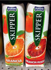 Zuegg propone due confezioni di Skipper, praticamente identiche, con la stessa immagine di un’arancia tagliata a metà. La prima reca in basso in modo ben visibile la scritta “arancia”, la seconda “arancia rossa”. Osservando meglio si scopre che sulla prima c’è scritto “succo 100% senza zuccheri aggiunti” mentre sulla seconda non compaiono diciture particolari, perchè si tratta di una bevanda con il 35% di succo di arancia allungato con acqua e ritoccato con zucchero e alcuni additivi.