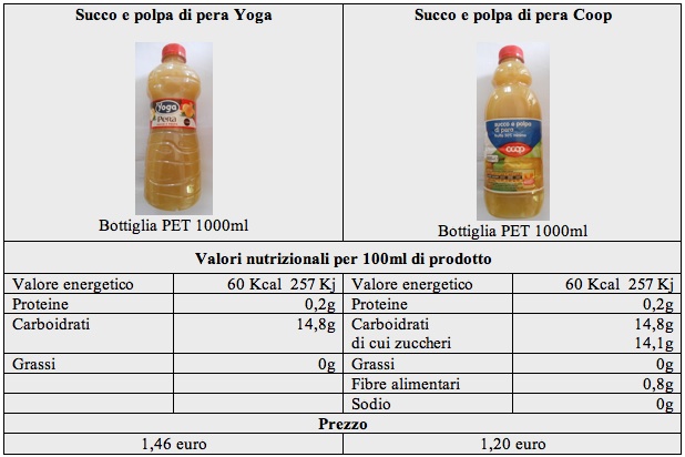Lo scaffale dei succhi di frutta al supermercato comprende bevande con differenti percentuali di polpa e succo concentrato che confondono le idee a consumatori. Il Fatto Alimentare ha messo a confronto il succo e polpa di pera Yoga (prodotto da Conserve Italia nello stabilimento di Barbiano di Cotignola), con il corrispettivo Coop realizzato dalla stessa azienda ma nello stabilimento di Massa Lombarda.