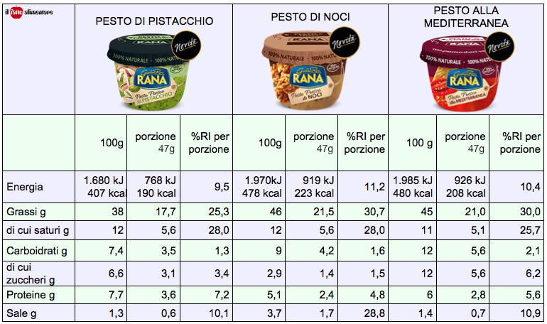 Sull’involucro di copertura tutti i vasetti riportano la dicitura 100% naturale anche se gli ingredienti includono alcuni elementi che in una preparazione casalinga difficilmente sono presenti, come ad esempio il lattosio, gli aromi e l’acqua. Tutte le ricette hanno l’olio extra vergine al primo posto e contemplano anche il formaggio grattugiato, la panna, il burro e il latte. Visto che si tratta di condimenti, non stupisce la presenza dei grassi come elemento nutritivo preponderante, mentre  incidono poco le noci e i pistacchi, tant’è che la quantità di grassi del pesto di noci è analoga a quella della ricetta alla mediterranea con pomodorini secchi.