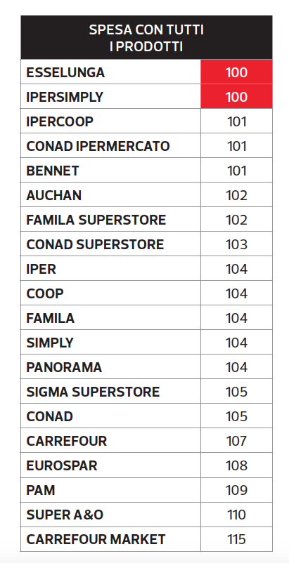 La classifica per chi mette nel carrello sia prodotti di marca sia articoli più economici vede in testa cinque insegne: Esselunga insieme a Ipersimply seguita da Ipercoop, Conad Ipermercato e Bennet (vedi tabella sotto).