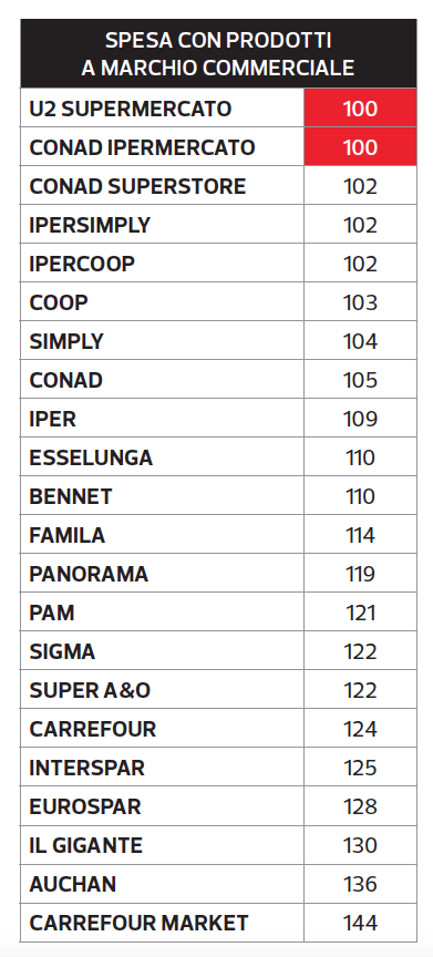 Il consiglio per le persone che abitualmente si orientano sui prodotti con il marchio dei supermercati (quelli con il logo della catena di vendita) è di scegliere U2 e gli ipermercati Conad (vedi tabella sotto). Chi invece è abituato a comprare negli hard discount la catena più conveniente è Eurospin. Secondo la rivista considerando la spesa media annuale di una famiglia italiana (6.320 euro), la scelta del punto vendita più economico della propria città permette di risparmiare anche 1.500 euro.