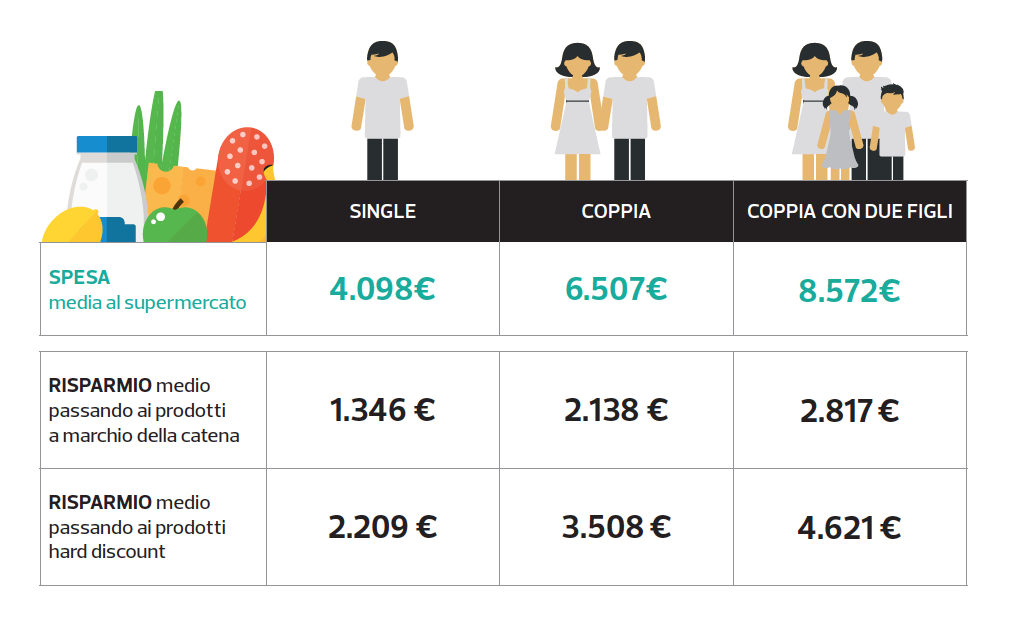 Ma vediamo gli esempi. Una persona single con una spesa annuale di 4.100 euro potrebbe scendere a 2.800 selezionando prodotti a marchio commerciale e dimezzare la cifra recandosi solo negli hard discount. Una coppia senza figli (budget annuale 6.500 euro) ridurrebbe l’importo di oltre 2.100 euro con i prodotti a marchio commerciale e lo dimezzerebbe recandosi al discount. Una famiglia di quattro persone che spende mediamente 8.600 euro comprando prodotti di marca, se si orienta sui articoli a marchio commerciale risparmierebbe oltre 2.800 euro mentre al discount ridurrebbe le uscite annuali di oltre 4.600 euro.