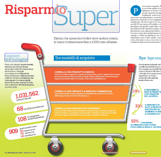 La rivista ha esaminato i listini di 38 punti vendita situati in città e nell’hinterland di centinaia di prodotti alimentari e di altre merceologie come detergenti e articoli per la cura del corpo, firmati dalle grandi aziende di marca. Secondo la rivista fare la spesa tutto l’anno in uno dei supermercati posizionati in cima alla classifica permette un risparmio di circa 900 euro rispetto alle insegne situate agli ultimi posti. Esselunga, che per molti anni ha goduto del primo posto ha ceduto da tempo lo scettro della convenienza e si posizione al quarto posto seguito da Iper, Carrefour e Ipercoop. Per essere precisi va detto che la differenza di listini in questo gruppo gruppo di supermercati situati nella parte alta della classifica oscilla al massimo del 7%.