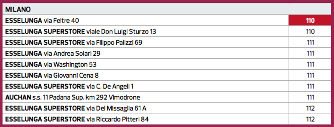 Dall’inchiesta emerge che i prezzi tra supermercati della stessa catena cambiano in relazione alla zona della città e in funzione della presenza di altre insegne nelle vicinanze in grado di fare concorrenza. Nelle ultime posizioni della classifica milanese troviamo tre supermercati della catena Carrefour, un Market (via Monza), un Gourmet (p.le Siena) e un Express (via della Moscova). Tra la prima e l’ultima posizione c’è un rincaro del 19%.