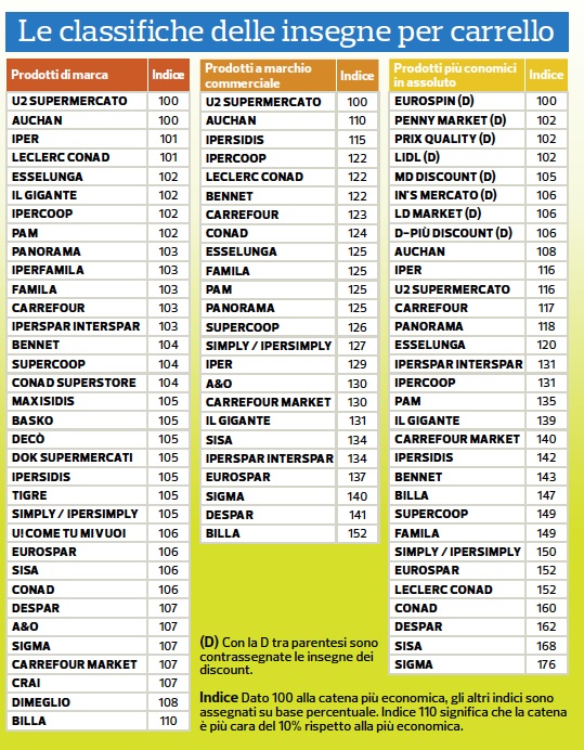 Mi sembra che l’Antitrust sia un po’ superficiale nello stilare queste classifiche e anche nel trarre queste conclusioni. Io frequento 3 supermercati: Conad, coop e esselunga. Conad ha prezzi diversi da città a città, a Genova è molto cara, a Firenze è una delle più comvenienti se si acquista a sconto. Frequentandola poi con molta assiduità conosco bene i prezzi e sono in grado di valutare se lo sconto è reale o meno. Diffido invece molto di Esselunga dove fanno sconti mirabolanti ma alzando il prezzo di partenza dello sconto!!!!Se un pacco di pasta costa 1 euro, la settimana dello sconto alzano il prezzo a 2 euro e ribassano del 50%. Purtroppo ho osservato questo fenomeno molto spesso. E durante i saldi lo fa anche Bata…. e mai nessuno che controlli 🙁