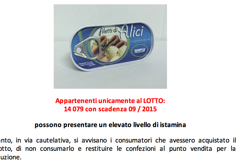 La catena di supermercati Simply ha ritirato dagli scaffali dei propri punti vendita per la terza volta in due mesi i “Filetti di alici in olio di oliva” a marchio Simply nella scatoletta da 46 grammi prodotto dalla società Iconsitt per eccesso di istamina. I lotti erano il n°14079 con termine minimo di conservazione 09/2015 , il n° 14132 con termine minimo di conservazione 11/2015 e il n° 14196 con termine minimo di conservazione 01/2016.