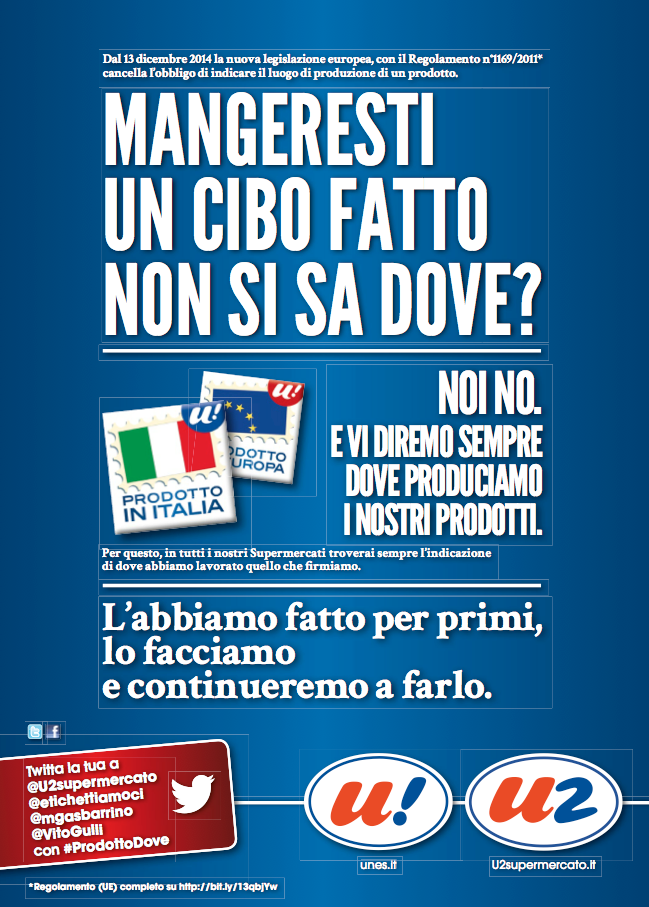 La catena di supermercati Unes è stata la prima azienda a comprare 3 pagine di giornale (dicembre 2014) su 3 quotidiani nazionali per ribadire la necessità di indicare in etichetta lo stabilimento di origine