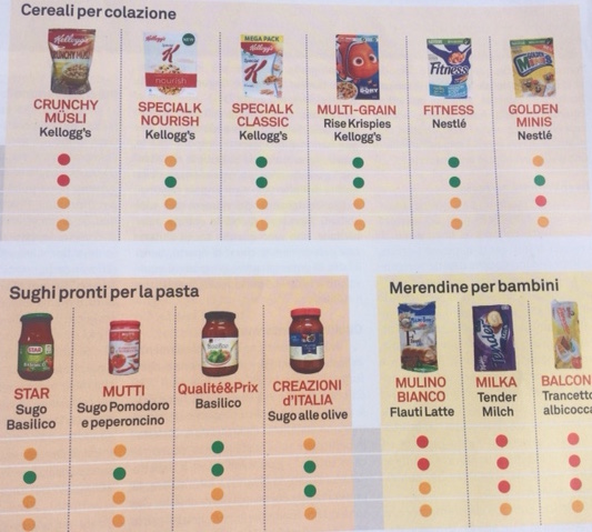 Quando si fa la spesa, giudicare se un prodotto sia sano oppure no a partire dalle informazioni fornite nelle etichette non è sempre facile, per questo l’associazione dei consumatori svizzera Acsi ha voluto testare il sistema “a semaforo” elaborato dalla Food Standards Agency britannica per mettere alla prova alcuni alimenti da un punto di vista nutrizionale. Per il test sono stati scelti prodotti posizionati negli scaffali ad altezza occhi che hanno più probabilità di essere acquistati. L’analisi ha preso in considerazione alimenti percepiti come salutari: cereali per la colazione, sughi pronti, merendine, pane croccante, barrette ai cereali, biscotti integrali e yogurt.