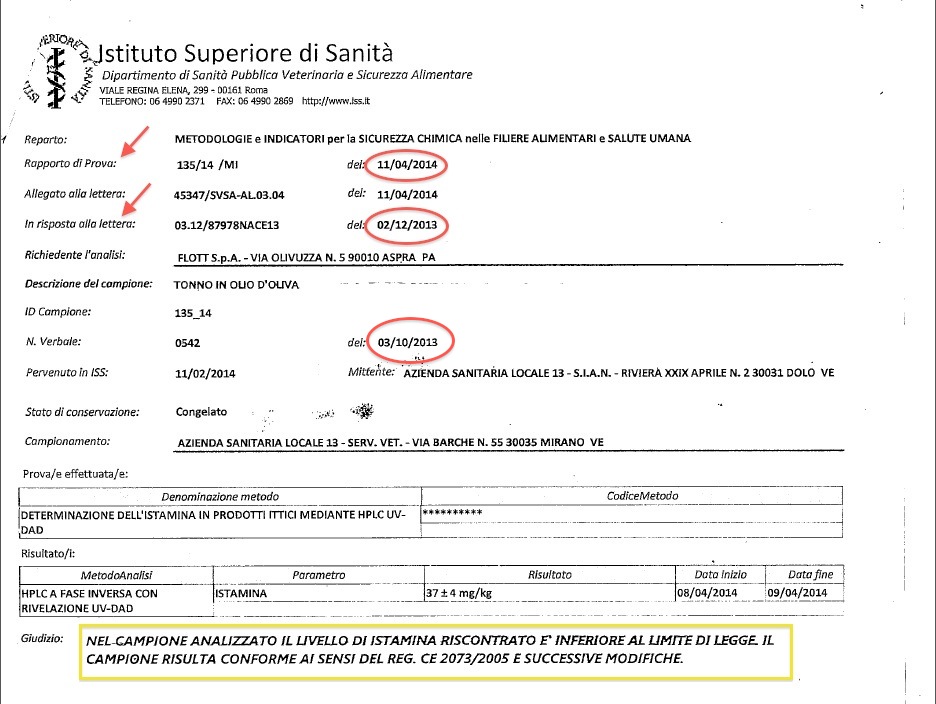Dopo sette mesi dalla pubblicazione dell’allerta e dal ritiro del Tonnotto dell’azienda L’Isola d’oro per presunti valori di istamina al di sopra del limite fissato per legge, quella partita di tonno viene dichiarata conforme. Questo è quanto si evince dalla documentazione inviataci da Marco Zarotti, amministratore dell’azienda. Ricordiamo che il prodotto ritirato era Il Tonnotto tamburello gr 550, lotto 13100, prodotto dalla ditta Flott Spa, Bagheria (PA) per conto della ditta L’Isola d’oro. La rettifica avviene a seguito della richiesta da parte dell’azienda dell’analisi di un controcampione. È doveroso notare il lasso di tempo che intercorre tra il ritiro del lotto incriminato a novembre e la conclusione della vicenda. Il documento dell’allerta riporta come data il 2 dicembre 2013, mentre le controanalisi realizzate dall’Istituto Superiore di Sanità indicano 11 aprile 2014 . Vuol dire che sono passati 4 mesi in totale per verificare se il tonno aveva un eccessivo contenuto di istamina! Nel frattempo ovviamente il lotto è stato ritirato creando non pochi problemi sia all’azienda sia ai consumatori. Aspettare quattro mesi per avere una riposta ad un ‘allerta è incompresibile e inaccettabile. riguarda anche la situazione opposta di rischi non segnalati tempestivamente, era già stata denunciata in un precedente articolo di Il Fatto Alimentare. È necessario quindi accorciare le tempistiche in entrambi i sensi per garantire la sicurezza alimentare.