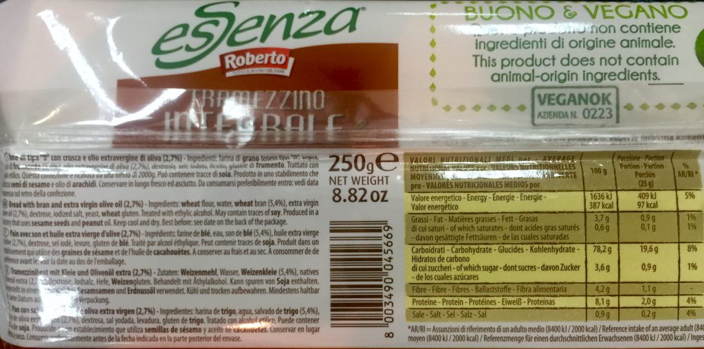 L’etichetta in esame, a ben vedere, rivela il ‘maquillage integrale’ già nella denominazione di vendita ‘pane di tipo 0 con aggiunta di crusca e olio extravergine di oliva’, di cui sono riportate le rispettive quantità in ricetta. La lista ingredienti, oltretutto, appare nel complesso pregevole: l’unico grasso impiegato é l’olio extravergine d’oliva, senza olio di palma né additivi di sorta. E il destrosio, comune alla categoria di prodotti, non ha la sola funzione di agevolare la lievitazione.