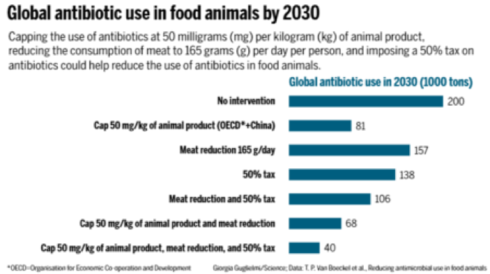 Per questo gli autori non si sono limitati a lanciare l’allarme, ma hanno fatto un po’ di conti per quanto riguarda possibili interventi da mettere in atto subito, ovunque, in attesa di atti quali l’imposizione di un limite massimo per tutti, per esempio quello di 50 milligrammi di antibiotici per chilo di carne prodotta nei paesi OCSE, che farebbe diminuire la quantità di farmaci nelle carni del 60%.