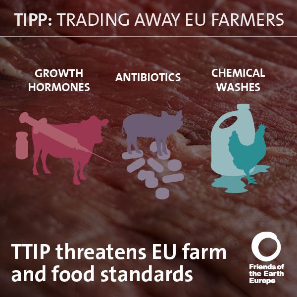 In questi giorni è stato pubblicato nei 17 Paesi europei interessati e negli Usa il rapporto Contadini europei in svendita – I rischi del TTIP per l’agricoltura europea, redatto da Friends of the Earth Europe (pubblicato in Italia in collaborazione con l’associazione Fairwatch). Il dossier segnala “ che il TTIP porterà a un’ulteriore intensificazione delle coltivazioni e della concentrazione nelle mani delle corporation dell’agricoltura sulle due sponde dell’Atlantico. Anche la sicurezza dei consumatori e la protezione ambientale ne verranno danneggiate perché sia il governo sia le organizzazioni dei produttori Usa stanno apertamente chiedendo all’Europa di indebolire i sistemi di protezione in ambiti quali l’approvazione di cibo Ogm, le regole sulla sicurezza dei pesticidi, il bando sugli ormoni e i lavaggi anti-patogeni nella produzione di carni di pollo”.