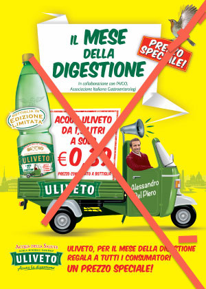 Da alcune settimane le pagine dei quotidiani come il Corriere della sera del 22 ottobre 2013, La Repubblica, Il Messaggero propongono la pubblicità dell’acqua minerale Uliveto. Nel messaggio compaiono per l’ennesima volta le parole “acqua della salute“, “aiuta la digestione” oltre alla collaborazione con l’Associazione italiana gastroenterologi (Aigo) e l’immancabile Alessandro Del Piero con l’uccellino.
