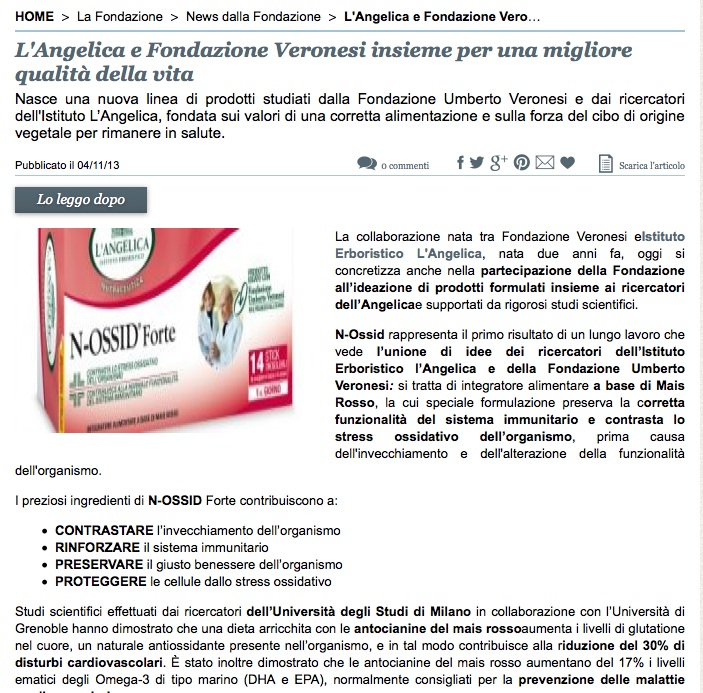 Collegandosi al sito della Fondazione Veronesi si legge che l’Istituto Erboristico Angelica ha stabilito una collaborazione, per mettere a punto integratori alimentari. N-Ossid è il primo risultato di un lungo lavoro che vede l’unione di idee dei ricercatori dell’Istituto Erboristico l’Angelica e della Fondazione Umberto Veronesi, “si tratta di integratore alimentare a base di Mais Rosso, la cui speciale formulazione preserva la corretta funzionalità del sistema immunitario e contrasta lo stress ossidativo dell’organismo, prima causa dell’invecchiamento e dell’alterazione della funzionalità dell’organismo“.