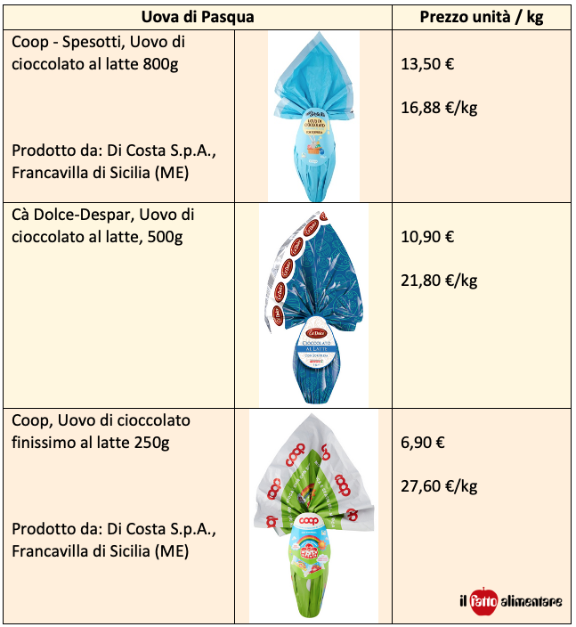 Per un uovo Bauli da 190 g con sorprese dei Kucciolotti si spendono circa 11 € (57 €/kg) e per l’uovo Balocco da 240 g dedicato alle squadre di calcio si spendono 12 € (50 €/kg). Ogni catena di supermercati poi propone anche uova di Pasqua con sorprese “anonime”, a prezzi più convenienti, e diversi prodotti in offerta, scontati anche del 25%, in questo modo la spesa scende intorno ai 30 €/kg, per arrivare in alcuni casi sotto ai 20 €/kg (vedi tabella) .