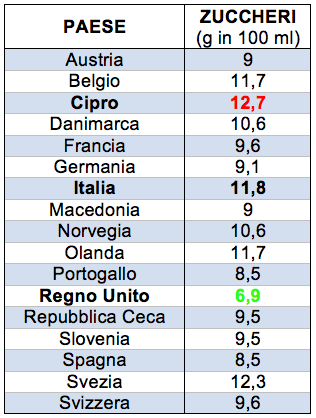 La categoria di alimenti con significative differenze nelle caratteristiche nutrizionali comprende un solo prodotto: la bibita gassata Fanta di Coca-Cola. La bevanda spicca per le marcate differenze nella quantità di zuccheri contenuti nelle bottiglie vendute nei diversi paesi europei. Il record negativo va a Cipro con 12.7 grammi di zuccheri semplici in 100 millilitri. Si tratta di un grammo in più rispetto alla Fanta venduta in Italia (11.8 g/100 ml) e quasi il doppio rispetto alla versione britannica, che ha solo 6.9 g/100 ml. Ma si trovano versioni anche con 8, 9 e 10 grammi: insomma, chi più ne ha più ne metta.
