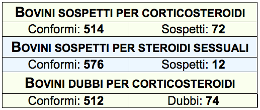 Dai rilevamenti effettuati in 18 Regioni (vedi tabella) risulta che l’esame istologico condotto su 72 bovini rispetto ad un totale di 514 sono stati classificati come “sospetti” per la presenza di corticosteroidi. Per quanto riguarda il trattamento illecito con ormoni steroidei sessuali i casi “sospetti” sono stati 12 rispetto a un totale di 576 capi esaminati. L’ultimo dato riguarda i casi “dubbi” per trattamento illecito a base di corticosteroidi: 74 su 512 capi (vedi filmato in fondo all’articolo).