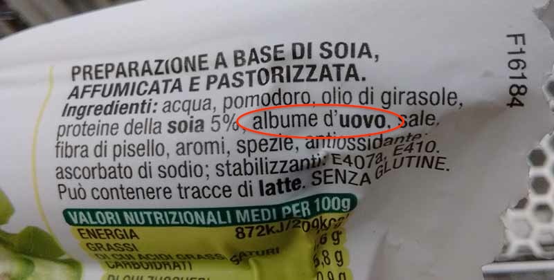 Vorrei segnalarvi una sospetta anomalia sulla confezione del “Würstel Vegetale Vita Leggera” prodotto dalla Principe di San Daniele S.p.A. Si evince a chiare lettere che dovrebbe trattarsi di un prodotto vegetale, quindi privo di proteine animali. Eppure fra gli ingredienti si legge “albume d’uovo”. Vorrei chiedervi se la cosa sia corretta e legale.