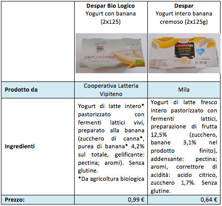 Quasi sempre esiste una significativa differenza di prezzo del prodotto bio rispetto a quello tradizionale, determinata dalle caratteristiche e dal metodo di produzione dei prodotti biologici. Se si valuta il prezzo al consumo medio delle versioni bio presenti sugli scaffali dei supermercati, questo risulta di circa il 30% superiore rispetto al prezzo medio dello yogurt normale. Per esempio, confrontando lo yogurt Despar BioLogico, gusto banana, nel formato vasetto di plastica 2×125, con il prodotto convenzionale Despar la differenza di prezzo è superiore al 55% (rilevata in un Eurospar in provincia di Brescia). Il primo, realizzato da Cooperativa Latteria Vipiteno, costa 0,99 euro, rispetto al prezzo di 0,64 euro dello yogurt non bio, prodotto per la catena distributiva da Mila.
