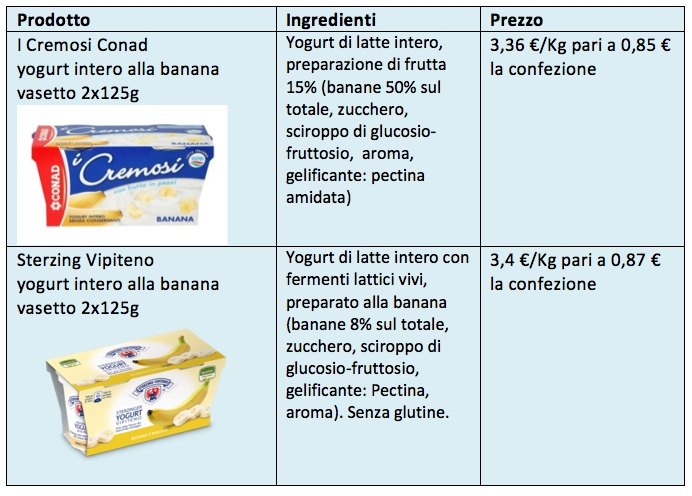 Il Fatto Alimentare ha messo a confronto lo yogurt al gusto di banana intero della Conad, nel formato 2x125g, con lo stesso yogurt firmato Sterzing Vipiteno. Entrambi sono prodotti da Latteria Vipiteno, cooperativa altoatesina , supportata da 485 soci che forniscono la materia prima insieme a 200 aziende del Nord Tirolo.