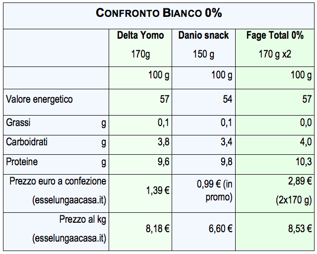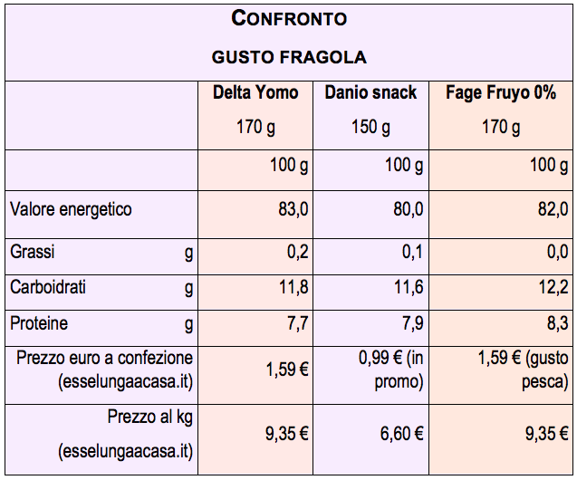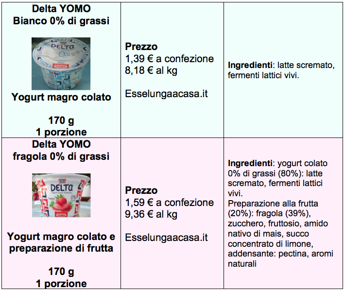 Il confronto diretto tra Delta Yomo con Danio Snack e Fage Fruyo mette in luce la forte analogia tra i prodotti (vedi tabelle sotto) ed emerge ancora una volta il maggiore apporto proteico del capostipite degli yogurt greci in Italia. Un aspetto da sottolineare è la differenza di prezzo tra i tre yogurt.